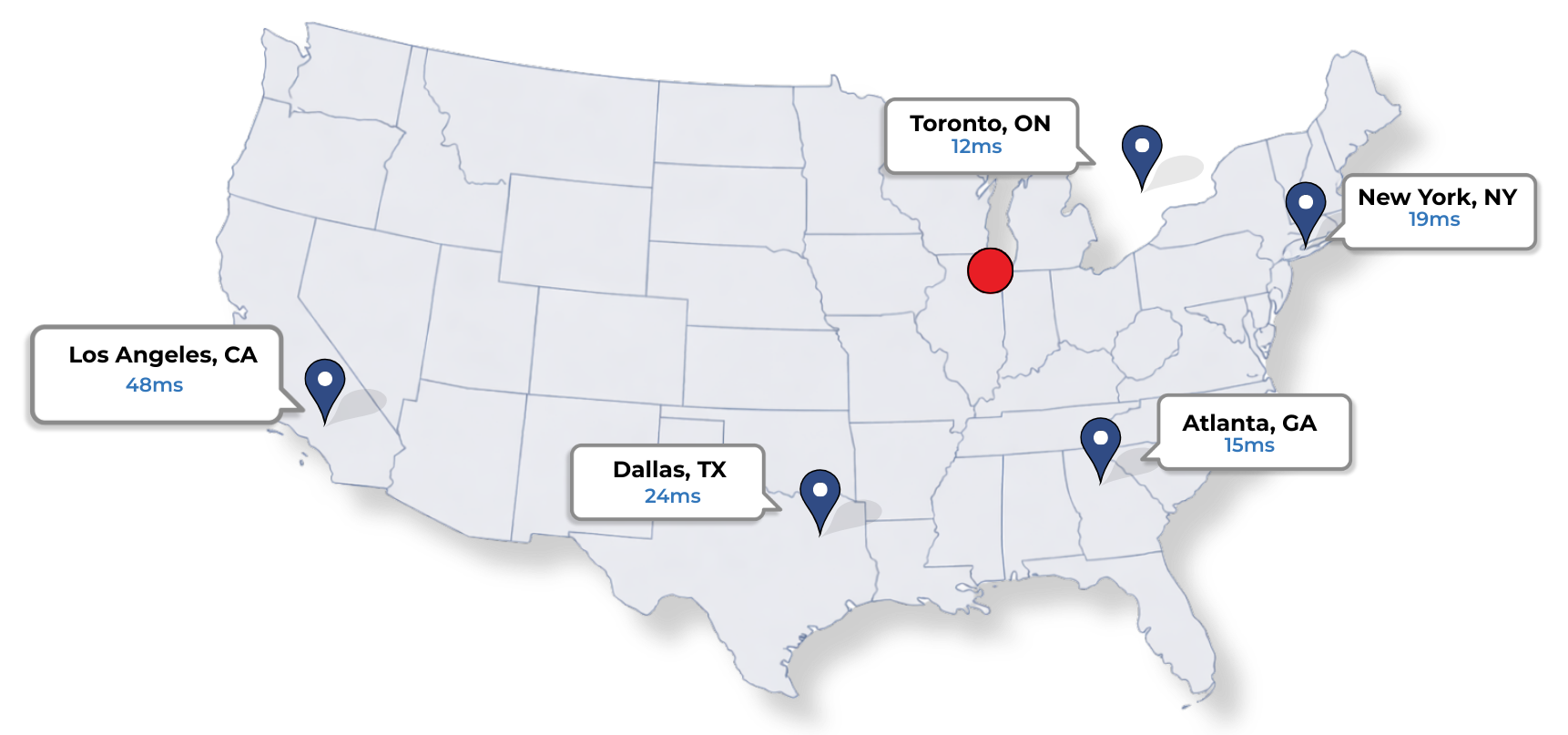 East Coast deployments typically favor northeastern users, while West Coast servers prioritize Pacific traffic. Chicago dedicated servers provide a more balanced alternative — delivering strong latency to New York, Atlanta, Dallas, and even Los Angeles from a single central location.